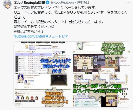 リュートピアの公式Xアカウントは エルナReutopia広報 です。 リュートピアの話題に関しては #リュートピア のタグを是非ご利用下さい。 広報エルナです。 エックスではゲームに関することやエックスを通しての特典などポストしていきます。 皆さま仲良くしてくださいね!